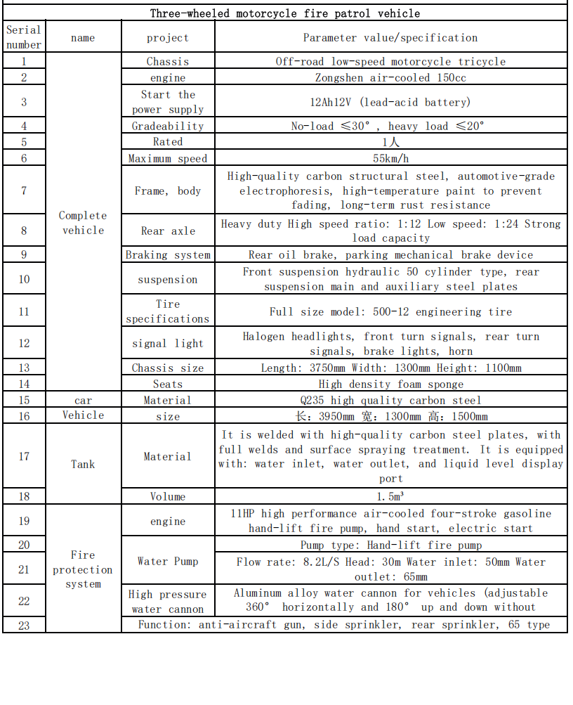 با توجه به درجه پایین جاده های روستایی و مسافت طولانی از ایستگاه های آتش نشانی ، می توان از موتور سیکلت های آتش سوزی سه چرخ به عنوان تجهیزات اصلی تیپ های آتش نشانی حرفه ای Township استفاده کرد. آنها می توانند وسایل بیشتری نسبت به وسایل نقلیه دو چرخ داشته باشند و نسبت به کامیون های آتش نشانی چهار چرخ ، با شرایط پیچیده جاده سازگار هستند و متوجه می شوند "ارسال پلیس در نزدیکی و دفع سریع".